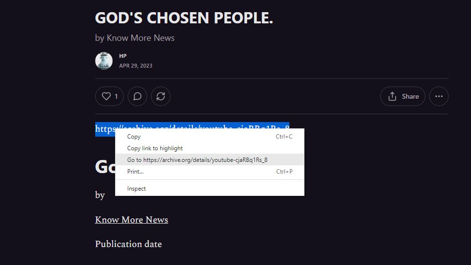 GOD'S CHOSEN PEOPLE.by Know More NewsHPApr 29, 2023∙ Paid64Sharehttps://archive.org/details/youtube-cjaRBq1Rs_8 God's Chosen PeoplebyKnow More NewsPublication date 2018-12-10Continue reading this post for free, courtesy of HP.Claim my free postOr purchase a paid subscription.